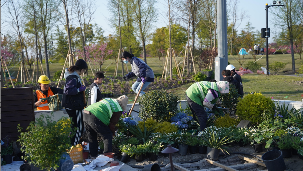 4月10日一早,奉贤上海之鱼泡泡公园“花好月圆”区域,已是一派繁忙景象。新鲜可爱的绣球花、新铺就的石板路、圆形的装饰灯具……谁能想到,如此美丽的花境竟是四所高校的几十名学生联合设计完成的,而从施工到完工,仅仅用了三天时间。