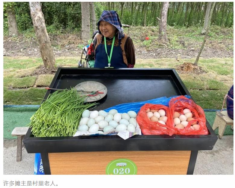 仔细观察,许多菜不似超市货架上的果蔬那般水灵,有的带着泥土,有的菜叶上有虫洞;摊主中不乏七八十岁头发花白的老人,一个小推车、几个泡沫箱就装上菜来了。这是专供沈陆村村民卖瓜果蔬菜的摊位,还在试运营阶段。