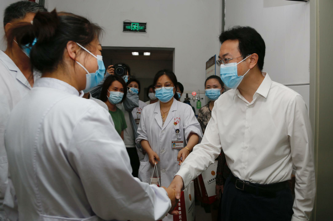 伴着炎热的酷暑,在奉贤区中医医院,王益群亲切慰问坚守在一线的医务工作者,并送上防暑慰问品。他感谢广大医务工作者不惧高温、忠诚履职的工作热情,叮嘱大家在高温下要注重自我调节,防暑降温,做好医疗服务保障工作。