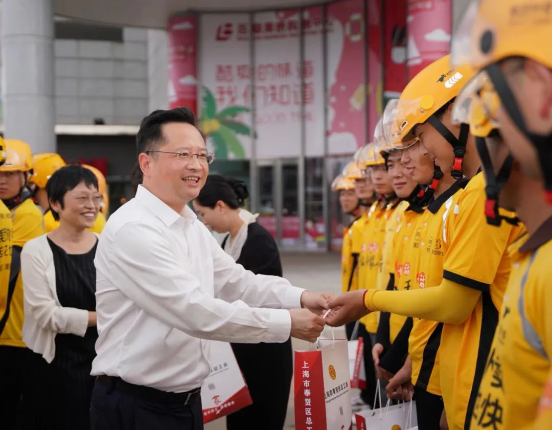 当天恰逢“717骑士节”,在百联南桥购物中心广场,袁泉亲切慰问新就业形态劳动者,并祝他们节日快乐。袁泉指出,快递外卖骑手等新就业形态劳动者,为社会生活服务提供了更多可能,是城市有序运行的重要组成部分,也是美好生活的创造者、守护者。希望大家要确保交通出行守法安全有序,争当食品安全的监督员、城市文明的传递者。