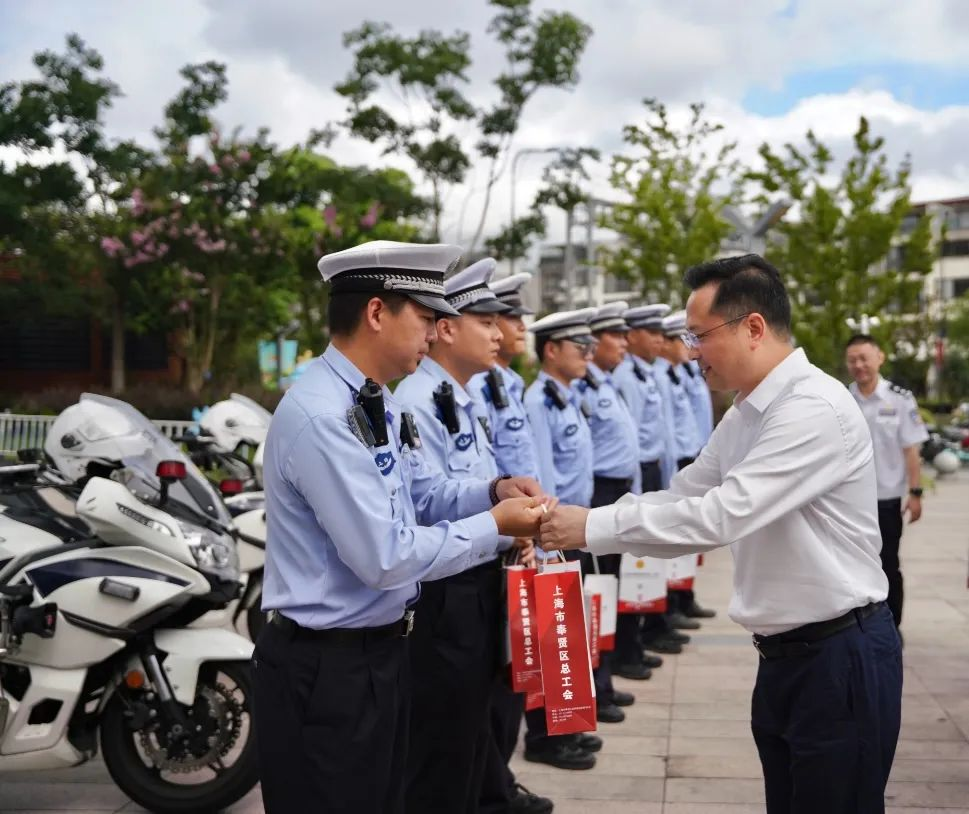 在宝龙城市广场,袁泉看望慰问公安奉贤分局交警支队民警,对他们不畏酷暑、积极作为的良好精神面貌给予充分肯定,并叮嘱他们在履行好职责的同时,也要科学安排作息时间,注意防暑降温、劳逸结合,保障自己的身体健康,以更好的工作状态服务人民群众。袁泉指出,良好的交通秩序往往是一座城市的“第一印象”,希望大家继续发扬吃苦耐劳的优良作风,坚持精细化、长效化要求,不断优化交通组织,努力营造更加安全畅通、和谐有序的美好交通环境,为奉贤高质量发展保驾护航。