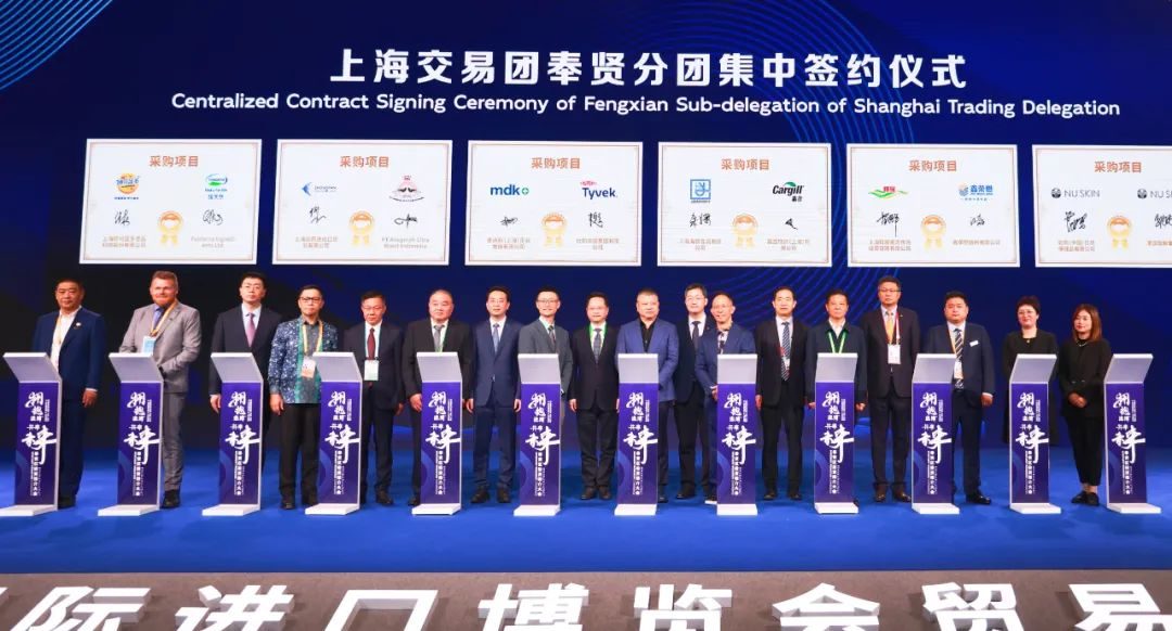 自11月5日第六届中国国际进口博览会举办以来,上海交易团奉贤分团捷报频传。在现场,上海妙可蓝多食品科技股份有限公司与Fonterra Ingredients Ltd.,上海众燕进出口贸易有限公司与印度尼西亚的PT.Anugerah Citra Walet Indonesia,美迪科(上海)企业发展有限公司与杜邦中国集团有限公司,上海海誉食品有限公司和嘉吉物资(上海)有限公司,上海辉展果蔬市场经营管理有限公司与鑫荣懋智利有限公司,如新(中国)日用保健品有限公司和美国如新集团,6对企业两两签约,采购成交的商品包括食品、水果、化妆品、原材料等。整个进博会期间奉贤交易分团完成12笔采购,总计金额5.83亿美元。