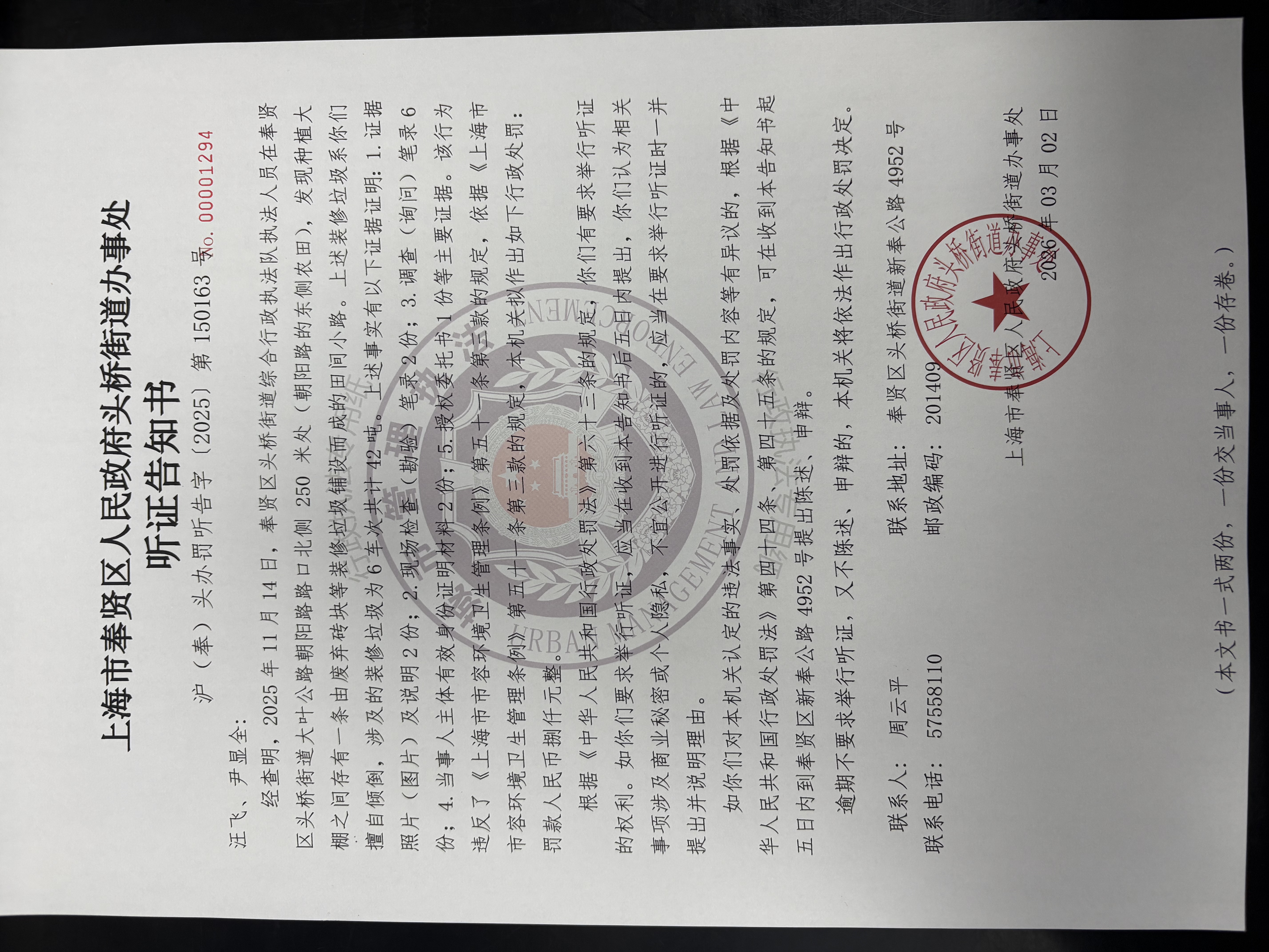 我单位于2025年11月20日立案查处的“汪飞、尹显全擅自倾倒装修垃圾案”一案,现已作出《听证告知书》,因无法用其他方式向你送达相关文书,依照《中华人民共和国民事诉讼法》第九十五条的规定,向你公告送达《听证告知书》(沪(奉)头办罚听告字〔2025〕第 150163号)。