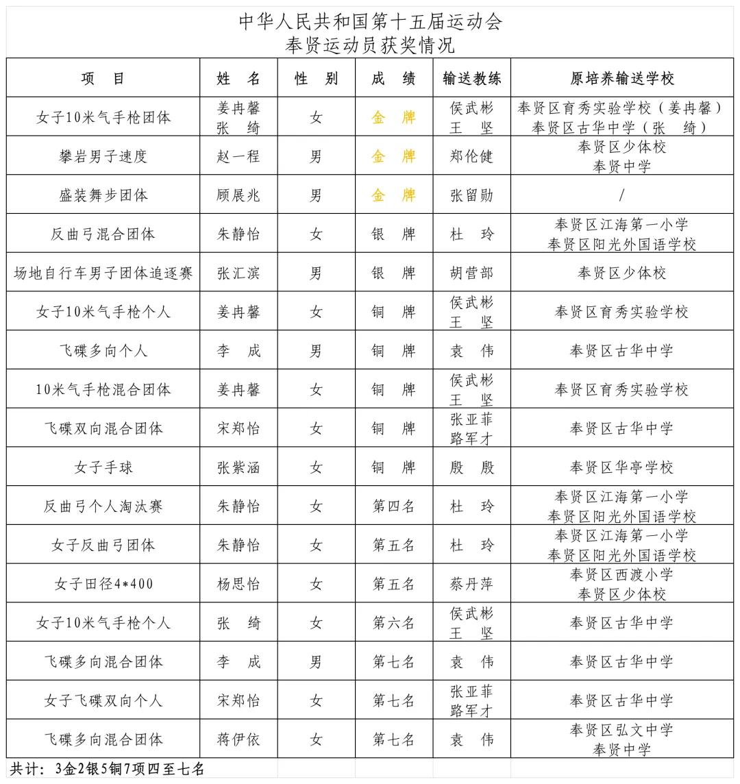 中华人民共和国第十五届运动会于11月21日在广东、香港、澳门胜利闭幕。在本届全运会上,我区共有18名运动员通过选拔,代表上海队参赛。各位运动员秉承着为上海市争光、为奉贤区添彩的信念,奋勇拼搏,取得了3金2银5铜7项四至七名的好成绩。