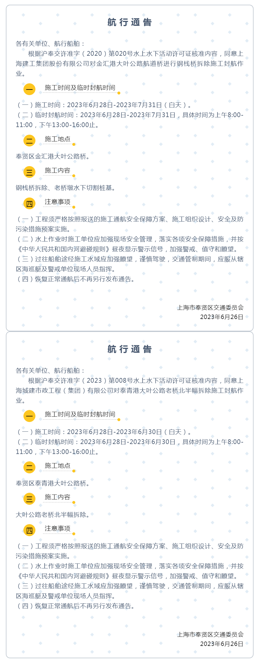 关于金汇港大叶公路桥钢栈桥拆除、泰青港大叶公路老桥北半幅拆除的航行通告