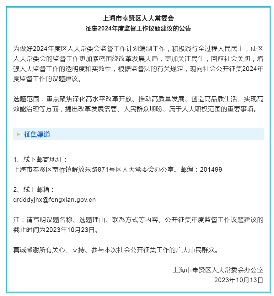 上海市奉贤区人大常委会向社会公开征集2024年度监督工作议题建议