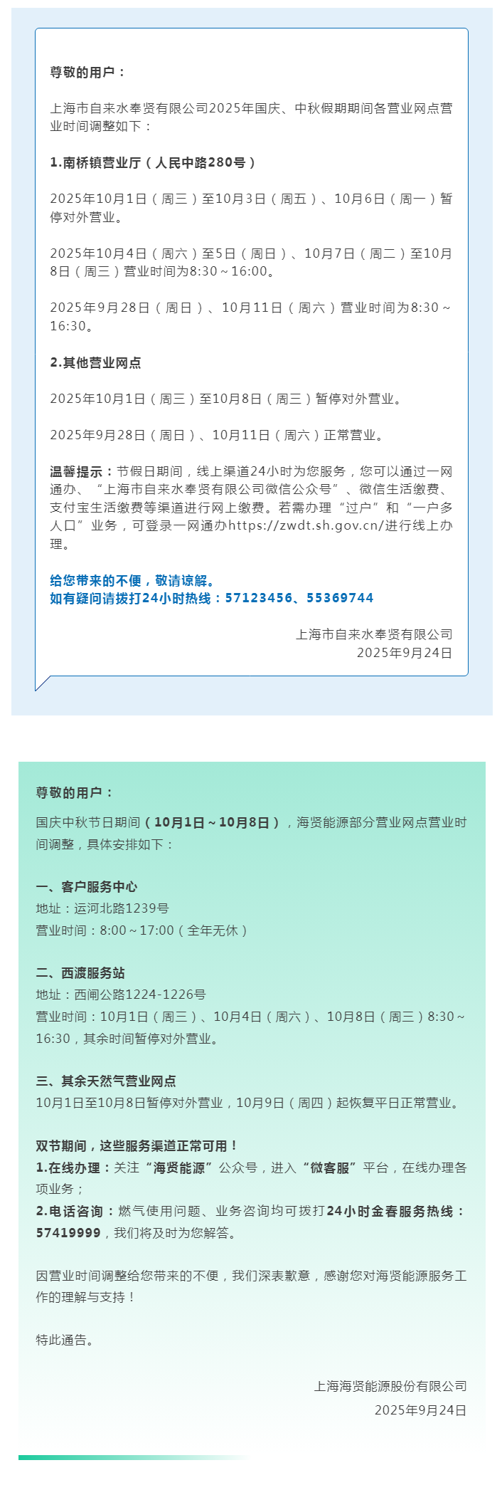 2025年国庆中秋期间,上水奉贤公司和海贤能源天然气营业网点时间有调整