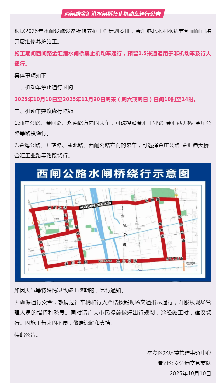 注意!西闸路金汇港水闸桥机动车将禁止通行,请绕行!