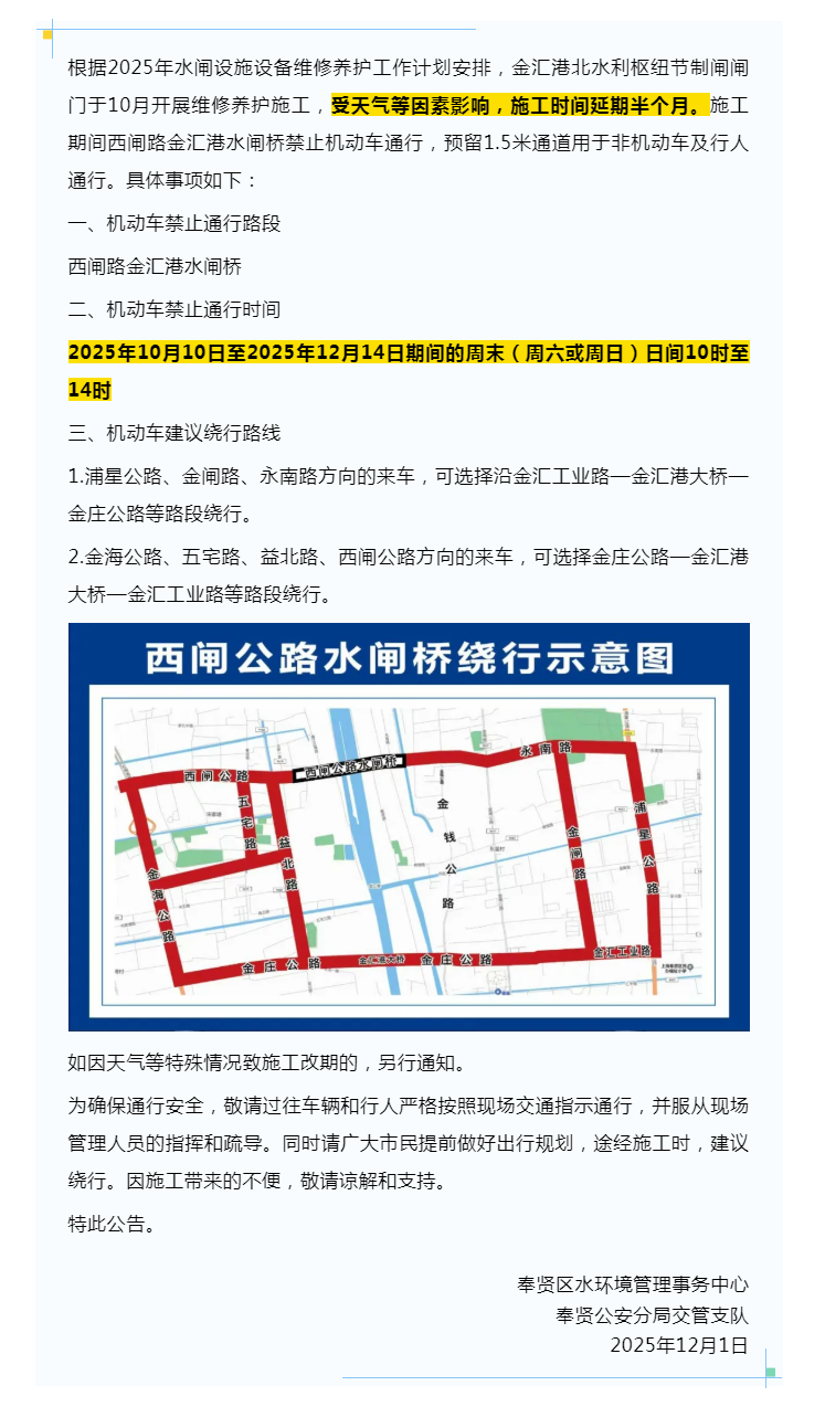 西闸路金汇港水闸桥部分时段机动车禁止通行时间延长,请注意绕行!