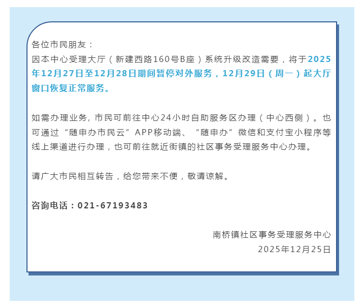 南桥镇社区事务受理服务中心暂停对外服务通知