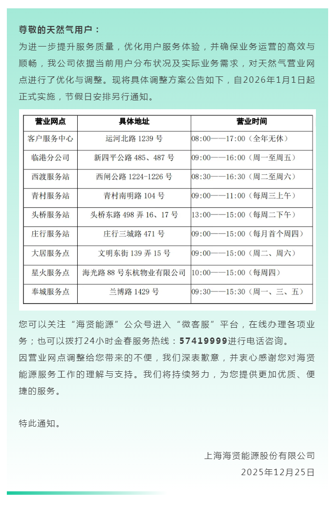 关于部分天然气营业网点调整的通知