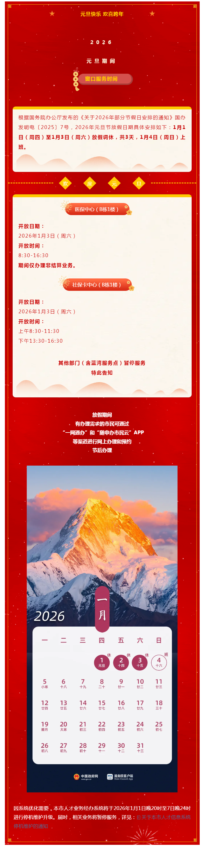 奉贤区政务服务中心2026年元旦期间窗口服务时间,点击查看→