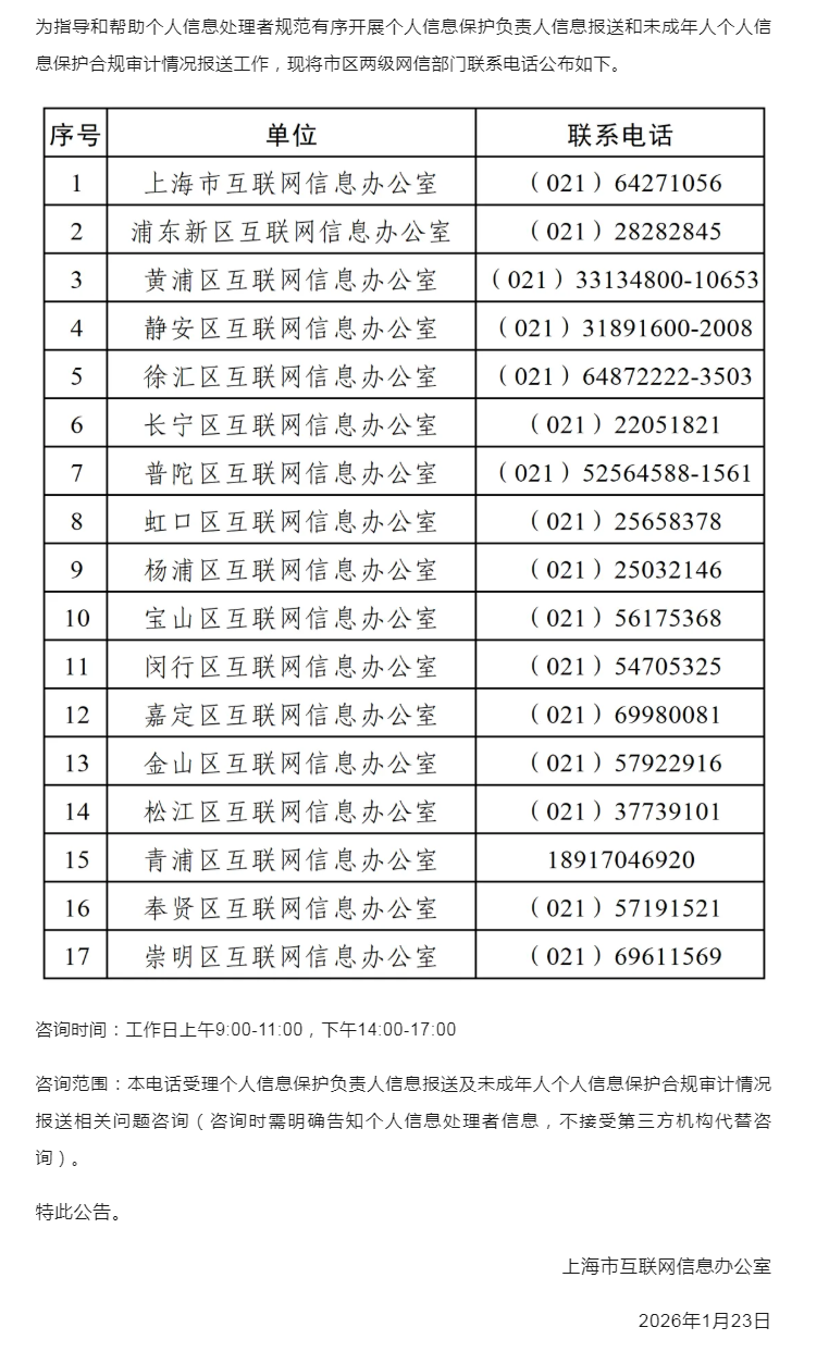 关于公布上海市个人信息保护负责人信息报送和未成年人个人信息保护合规审计情况报送工作咨询电话的公告