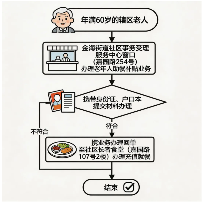 目前,食堂实行刷卡就餐制,年满60周岁的金海街道辖区老人,可携带身份证、户口本前往街道社区事务受理服务中心窗口提交材料,领取业务办理回单后,到食堂完成充值,即可便捷就餐。
