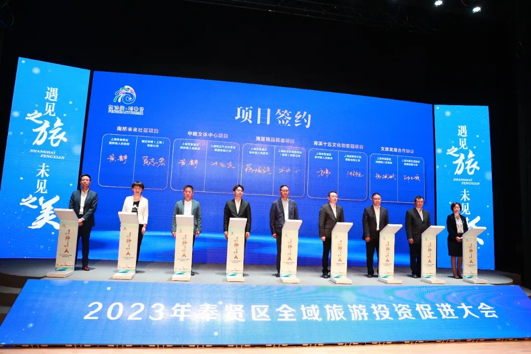雅高集团、中青旅、庄行镇、青村镇、杭州湾、海国文化分别围绕文旅资源、项目投资等进行现场推介。海里精品民宿、青溪15号文化创意园、悟博园文化产业、水魔方水上运动等16个项目进行现场签约。会上,还向新一批荣获国家级乡村旅游重点村、市级乡村旅游重点村、上海市民“家门口好去处”和奉贤区“悠‘贤’好去处”单位代表授牌,并发布了都市、乡村、滨海等5条精品旅游路线H5版。