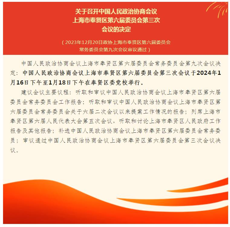 公告丨关于召开中国人民政治协商会议上海市奉贤区第六届委员会第三次会议的决定