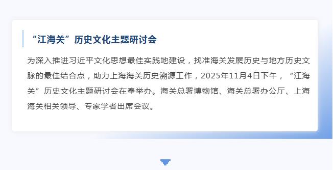 下一步,奉贤将以此次研讨会为契机,把研讨成果转化为实际工作成效,加快推进“江海关”项目建设,继续深化“江海关”历史文化研究,创新文化传播与运营模式。同时,加强与海关系统沟通联系,在展陈策划、运营管理等方面开展全方位的合作与链接,将“江海关”打造为具有影响力的文化品牌,共同助力奉贤文旅融合发展。